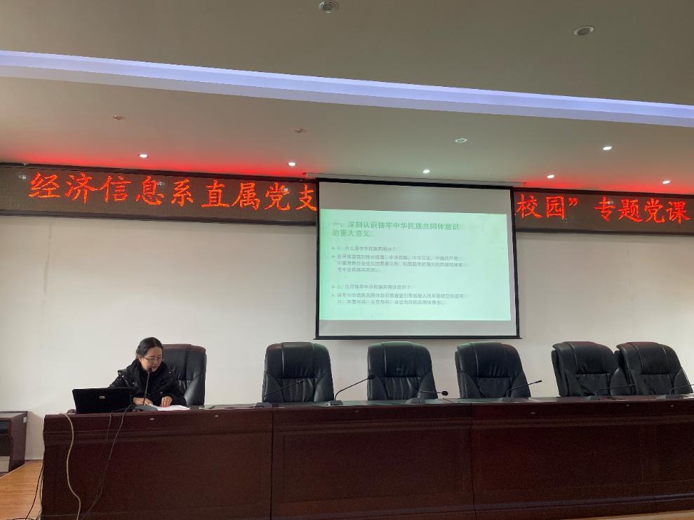 为深入贯彻中央民族工作会议,全国民族团结进步表彰大会精神,树立正确的国家观、民族观、历史观、文化观、宗教观,深刻认识“三个离不开”的重要意义,践行守望相助理念,筑牢中华民族共同意识,在推进民族团结、边疆稳定、社会和谐中发挥作用。根据《经济信息系直属党支部深入开展中央民族工作会议精神铸牢中华民族共同体意识教育工作实施方案》,2021年11月23日下午,经济信息系直属党支部邀请思想政治工作部主任王丽萍同志,在大会议室开展“民族团结进校园”专题党课。参加党课的人员有党支部全体党员、入党积极分子和发展对象。会议由支部书记高翠同志主持。