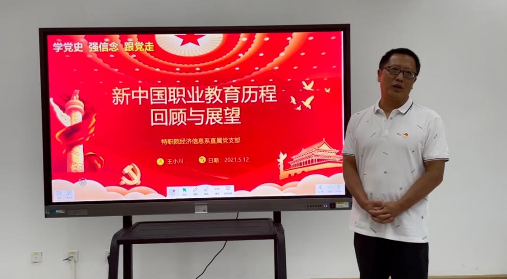 2021年5月12日下午3点,经济信息系党支部在实训楼206召开书记讲党课活动,会议主题为“学党史 强信念 跟党走————新中国职业教育历程回顾与展望”,支部党员教师、积极分子和学生代表参加专题学习。