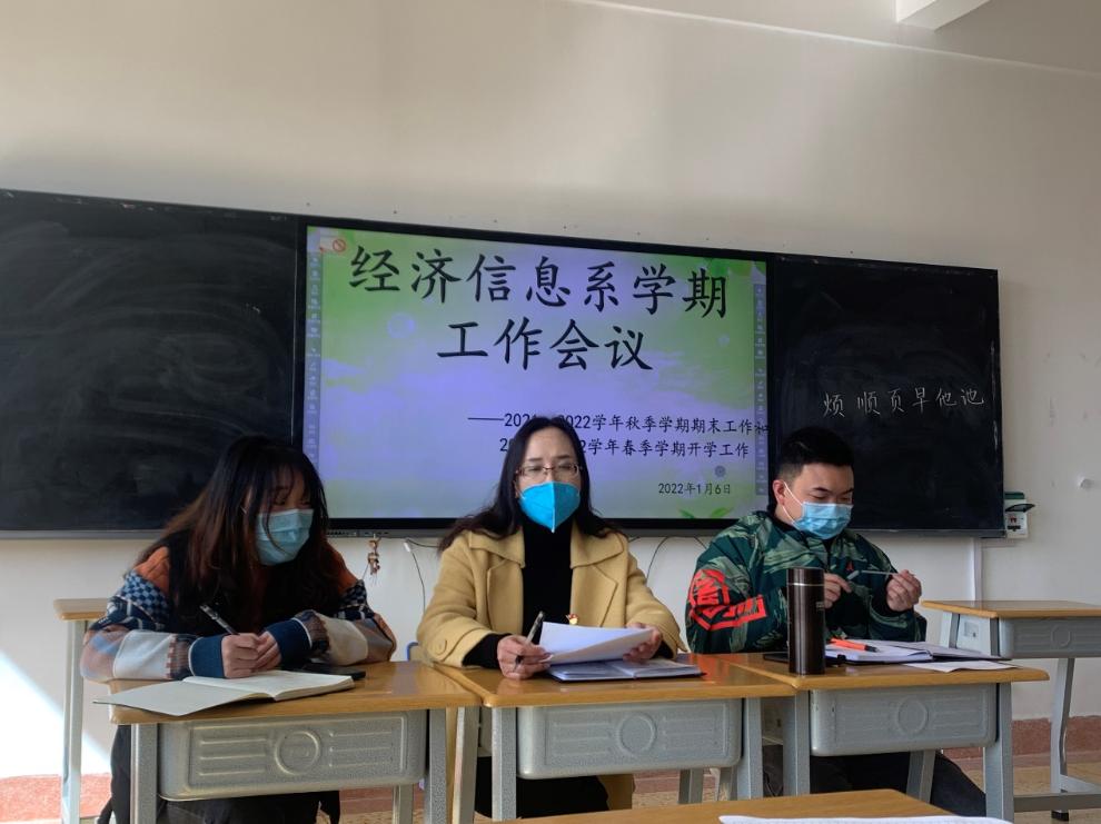 2022年1月6日,经济信息系全体教职工在玉璋楼401召开2021——2022年度秋季学期期末总结和2021——2022年度春季学期工作安排会议。回顾过去一学期走过的历程,总结成绩与不足,展望新学期全新的征途,规划重点和蓝图。会议由教学秘书王艳娥主持。