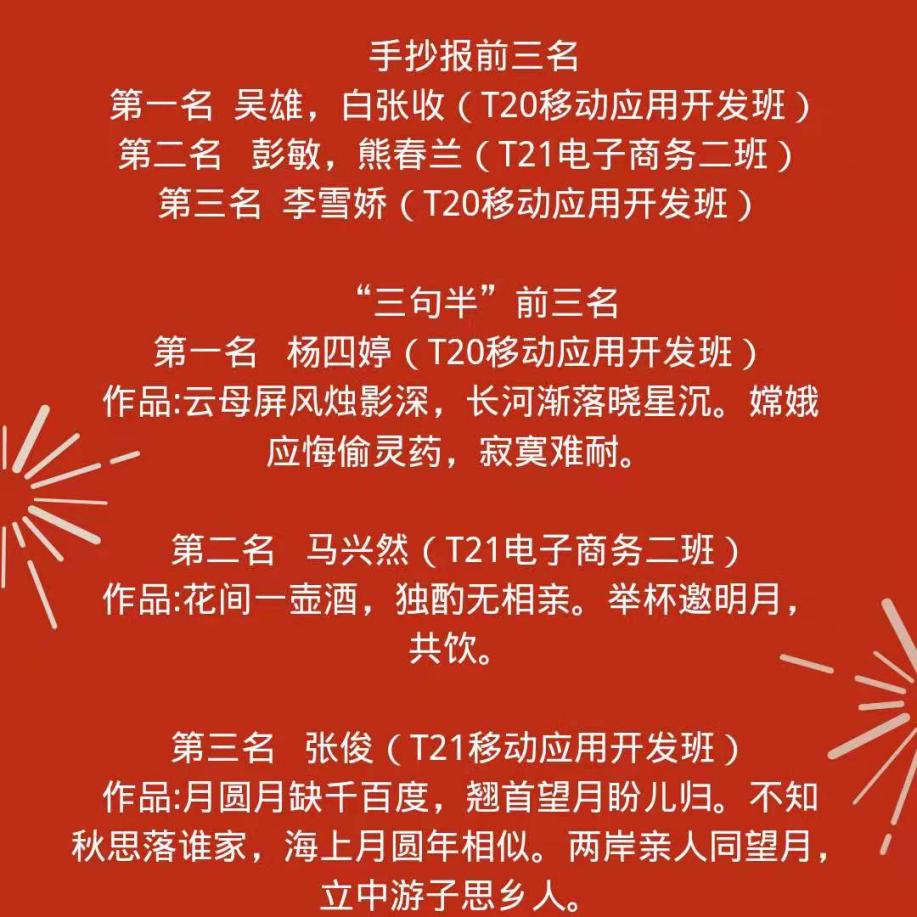 同学们用手中的画笔描绘一幅幅生动鲜明的图片,精选一段段经典的文字诠释了中秋的起源、传说、习俗、寓意。用诗词、歌谣表达了对幸福生活的珍惜,对美好未来的憧憬,对传统节日的热爱。此次活动同学们积极参加,共有51名同学制作手抄报,48位同学参加“三句半”活动。经过同学们在易班线上三天仔细评比的投票,两个活动各评选了最优秀的前三名作品。