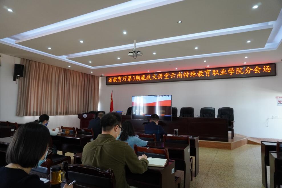“五四”青年节即将到来之际,省教育厅为深入推进“清廉机关”“清廉校园”的建设,从严从实加强对年轻干部的教育管理监督,形成崇廉尚廉的良好风尚,不断激发干事创业,跨越奋进的精气神,4月29日上午,省教育厅组织开展2022年第3期云南教育廉政大讲堂,点点官网在诵弦楼大会议室设立分会场,院领导及“80后”科级干部参加会议。
