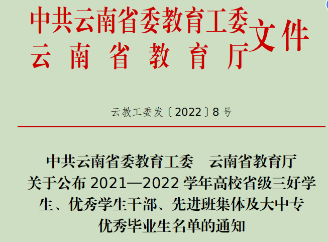 2022年3月,按照《云南省委教育工委、云南省教育厅关于开展2021-2022学年省级三好学生、优秀学生干部、先进班集体和2022届优秀毕业生推选工作的通知》要求,点点官网高度重视并积极开展推选工作。
