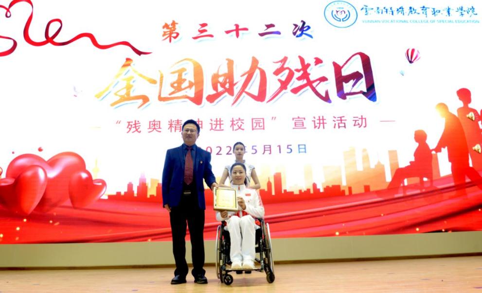 云南省残疾人联合会党组书记、理事长赵正富宣布“残奥精神进校园”宣讲活动启动。学院党委副书记、院长董亮代表学院为冬残奥会“三金冠军”杨洪琼授予了“杰出校友”荣誉称号。