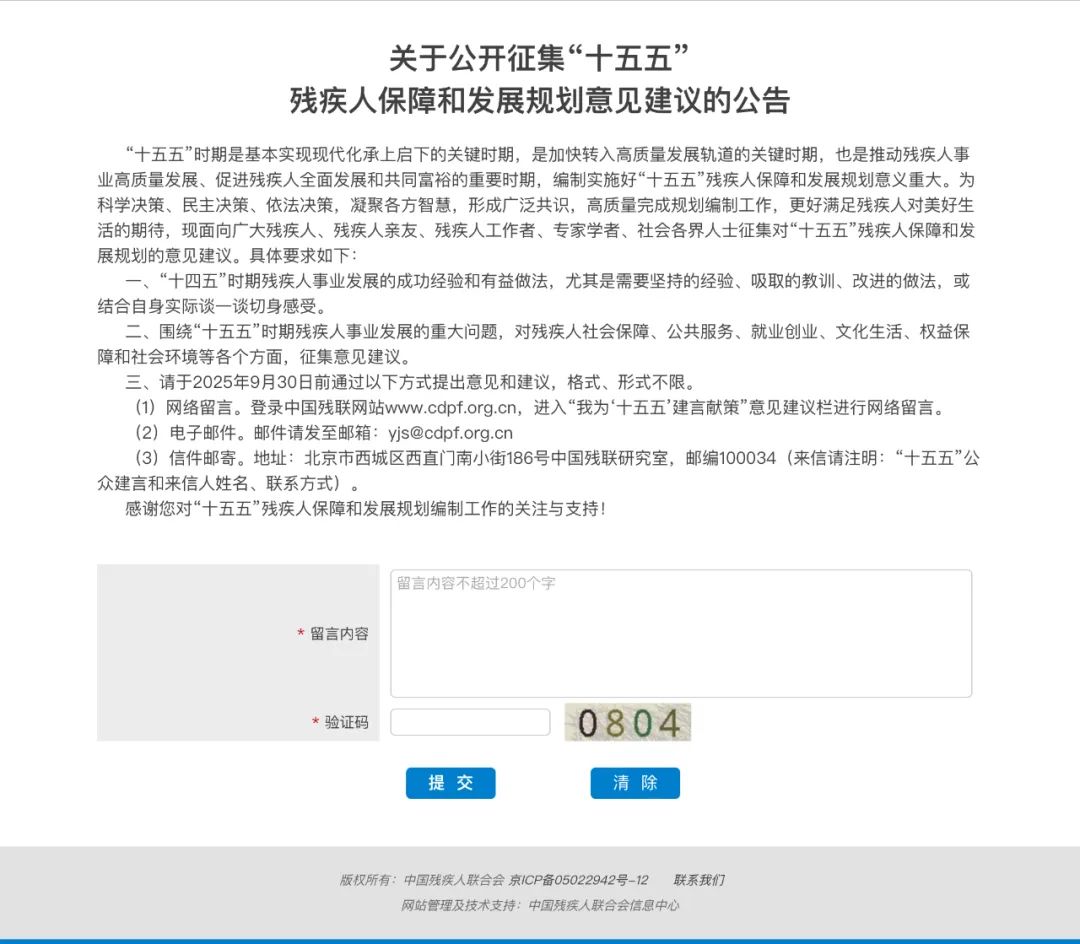 “十五五”时期是基本实现现代化承上启下的关键时期,是加快转入高质量发展轨道的关键时期,也是推动残疾人事业高质量发展、促进残疾人全面发展和共同富裕的重要时期,编制实施好“十五五”残疾人保障和发展规划意义重大。为科学决策、民主决策、依法决策,凝聚各方智慧,形成广泛共识,高质量完成规划编制工作,更好满足残疾人对美好生活的期待,现面向广大残疾人、残疾人亲友、残疾人工作者、专家学者、社会各界人士征集对“十五五”残疾人保障和发展规划的意见建议。具体要求如下:一、“十四五”时期残疾人事业发展的成功经验和有益做法,尤其是需要坚持的经验、吸取的教训、改进的做法,或结合自身实际谈一谈切身感受。二、围绕“十五五”时期残疾人事业发展的重大问题,对残疾人社会保障、公共服务、就业创业、文化生活、权益保障和社会环境等各个方面,征集意见建议。三、请于2025年9月30日前通过以下方式提出意见和建议,格式、形式不限。(1)网络留言。登录中国残联网站www.cdpf.org.cn,进入“我为‘十五五’建言献策”意见建议栏进行网络留言。(点击文末“阅读原文”可直接跳转留言界面)(2)电子邮件。邮件请发至邮箱:yjs@cdpf.org.cn(3)信件邮寄。地址:北京市西城区西直门南小街186号中国残联研究室,邮编100034(来信请注明:“十五五”公众建言和来信人姓名、联系方式)。感谢您对“十五五”残疾人保障和发展规划编制工作的关注与支持!