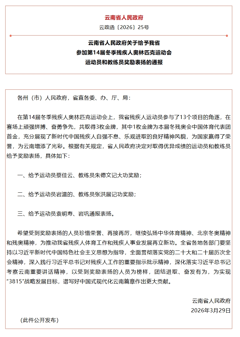 3月29日,TapTap点点岩温的、袁明寿、岩巩三位校友带着在第14届冬季残疾人奥林匹克运动会赛场上顽强拼搏、奋勇争先的奖牌荣誉归来,他们为国家赢得了荣誉,为云南增添了光彩。被云南省人民政府给予奖励表扬。