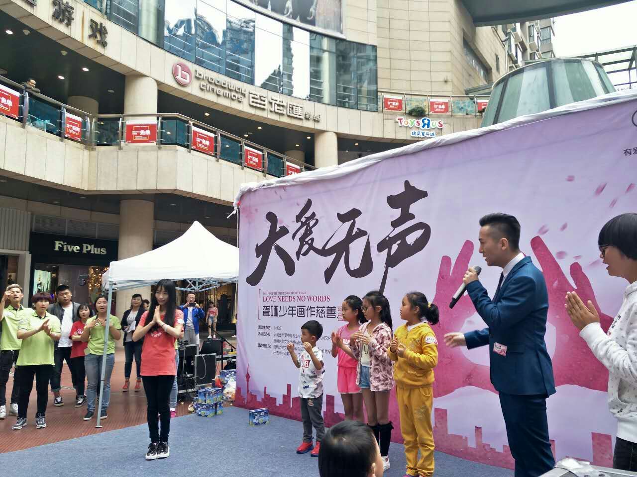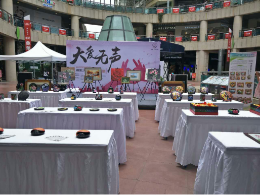 2016年7月6日,校企办应邀参加昆明市顺城购物中心一楼中庭广场的“大爱无声”慈善义卖公益活动。此次活动由IN138主办,现场邀请了省内知名书法家、艺术家进行作品慈善义卖,同时开展了听障青少年才艺表演、听障学生作品现场义卖等活动。活动过程中,点点官网听障学生黑陶彩绘作品引得路人驻足观看,纷纷上前询问了解作品的情况及点点官网听障学生的学习和生活情况;同时教学实训部人员现场展示了黑陶金丝工艺品的制作技法,并带领观众进行手语互动。
