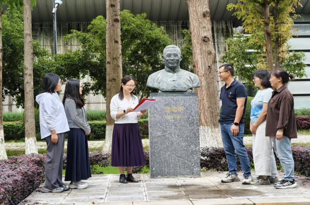 参观结束后,全体党员教师来到张伯苓先生雕像前集中学习《新时代高校教师职业行为十项准则》。马克思主义学院党支部书记、院长王丽萍结合张伯苓先生“爱国三问”再次强调了思政教育中以爱国主义教育为核心的教育原则,逐条解读准则的核心要求,强调新时代高校教师需以准则为标尺,以张伯苓先生等先辈为榜样,在特殊教育领域,坚守育人初心、严守师德底线。