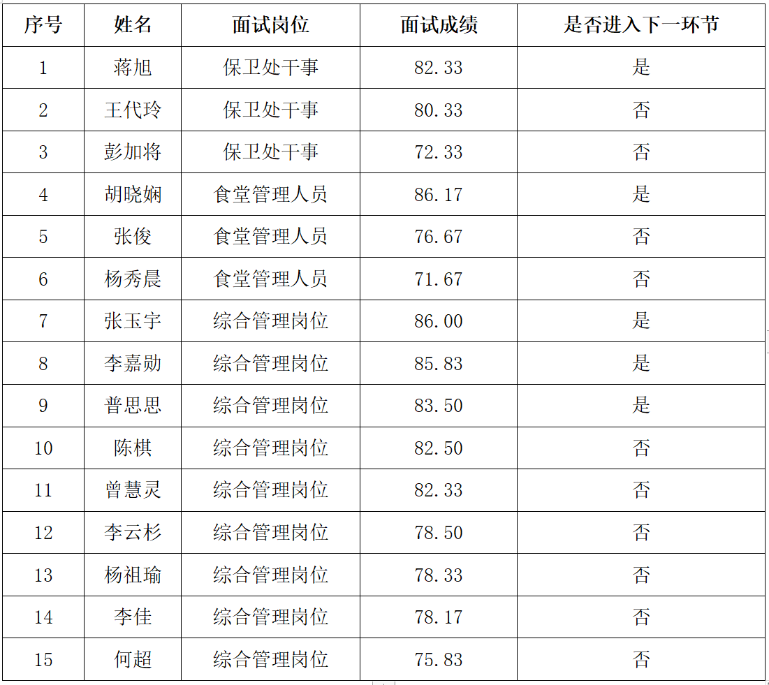 进入下一环节的拟聘人员将由学校按规定组织开展考察工作和教职员工准入查询,公示期内请准备好考察材料:1、户口所在地派出所出具的无犯罪证明;2、在职人员需提供所在单位出具的现实表现相关材料。考察环节放弃或考察不合格的按照面试成绩由高到低依次递补。