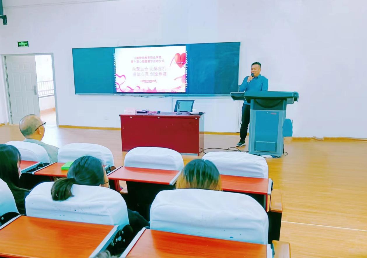 为帮助全院师生更好的解决后疫情时代的心理问题,学院第六届心理健康节以“关爱生命 化解危机 启迪心灵 创造幸福”为主题。通过心理健康知识讲座、心理知识宣传周、彩绘风筝户外活动、师生团体心理辅导、心理剧大赛等一系列丰富多彩的活动,帮助师生感悟生命,提升心理健康水平。启动仪式以云南大学解亚宁教授的心理讲座开篇,学生代表毛忠菊做发言。学院党委副书记石安银在启动仪式中做动员讲话,讲话中石安银要求青年学生珍爱生命、敬畏生命、升华生命,要把个人融入时代、将信仰融入生命,自觉把实现个人价值融入实现中华民族伟大复兴的中国梦中,不断升华和超越,活出一个健康幸福和阳光向上的自我。最后学院党委书记孙继先宣布第六届心理健康节正式启动!