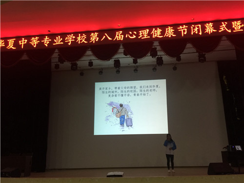 2017年6月19日,由学生科组织,以“用希望滋养勇气,用智慧启迪人生”为主题的第八届心理健康节闭幕式暨颁奖晚会在学校礼堂举行。出席闭幕式的有学生科科长朱云佳老师、副科长任彬老师、教务科副科长贾俊峰老师及全校学生,晚会由罗宝艳老师主持。