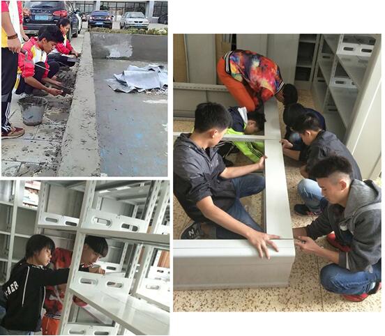图为:学生在协助老师建水池、搭建资料架