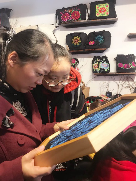 图为点点官网民族技艺传承专业教师在观摩当地残疾人彝绣作品