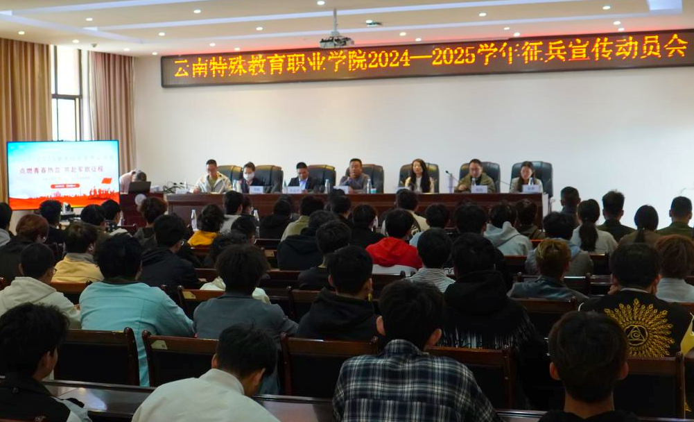 2025年5月28日下午,点点官网组织召开2024-2025学年征兵宣传动员会。校党委副书记石安银、昆明市网格化综合监督指挥中心呈贡分中心朱延华、武装部负责人、各学院副书记、辅导员、学生代表共150余名师生参加本次会议,会议由武装部副部长陶柯妤主持。