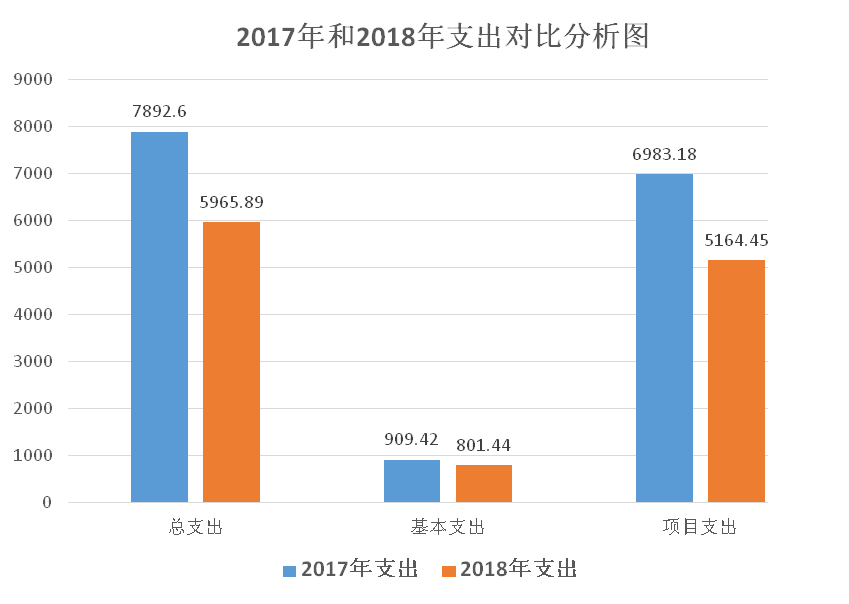 部门决算总支出合计5965.89万元,其中:基本支出873.04万元,占总支出的14.63%;项目支出5092.85万元,占总支出的85.37%。与上年决算总支出7892.6万元,减少1926.71万元,减少了24.41%,主要原因是基建项目接近完工,款项比去年投入减少。