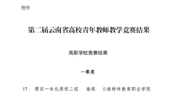 近日,云南省总工会、云南省教育厅联合公布第二届云南省高校青年教师教学竞赛结果,教育与康养学院谢英老师代表学校参赛,凭借扎实的教学功底、精湛的教学技能和新颖的教学设计,在高职院校理实一体化课程二组的激烈角逐中脱颖而出,荣获一等奖,为学校赢得了荣誉。