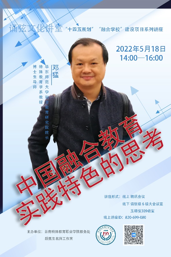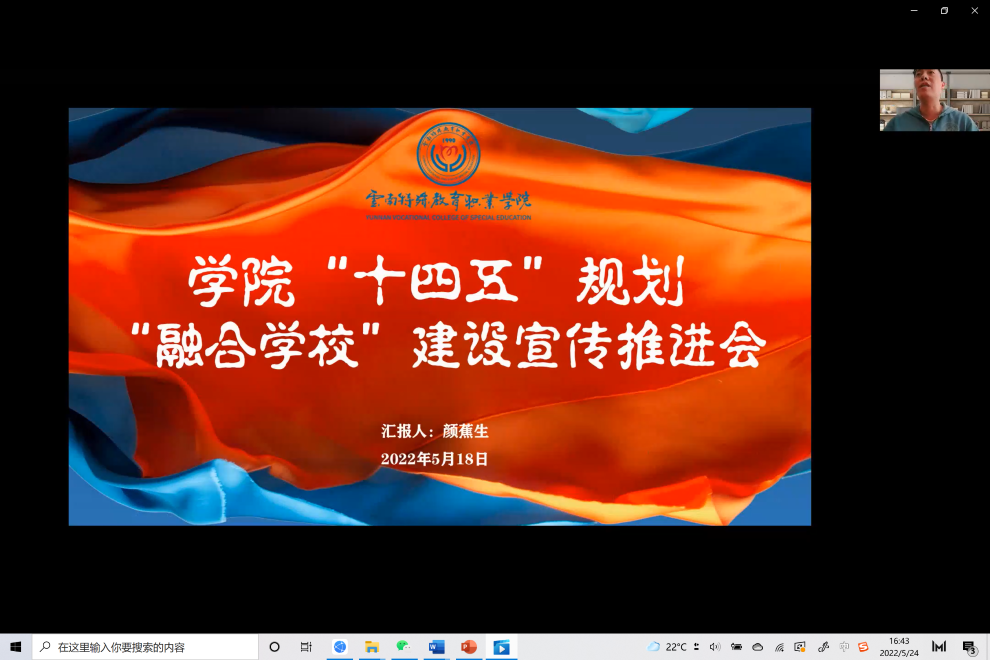 为深入学习领会《云南省“十四五”特殊教育发展提升行动方案》文件精神,贯彻落实《TapTap点点关于印发“十四五”发展规划和二〇三五年远景目标纲要的通知》中“融合校园”的建设目标,坚持“残健结合、共同发展、融合教育、服务社会”的办学理念,切实落实“三全育人”,打造“融合发展的文化格局”和一流的校风、教风、学风,持续深入了解特殊教育发展趋势和最新前沿理论,2022年5月18日下午,以主会场及线上分会场的形式,学院教务处与云南省“高层次人才培养计划”教学名师颜蕉生工作室共同举办“中国融合教育实践特色的思考”讲座暨“十四五规划”建设项目“融合学校”宣讲会。