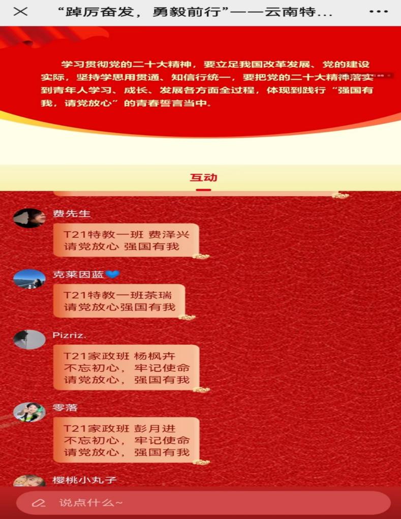 参与学习的师生们积极参与互动,纷纷发表感言,充分表达对党、对伟大祖国的挚爱之情,表达青年的理想与责任担当,表达了要努力学习、奋发有为、报效祖国的强烈愿望,发出了“请党放心、强国有我”的铮铮誓言。