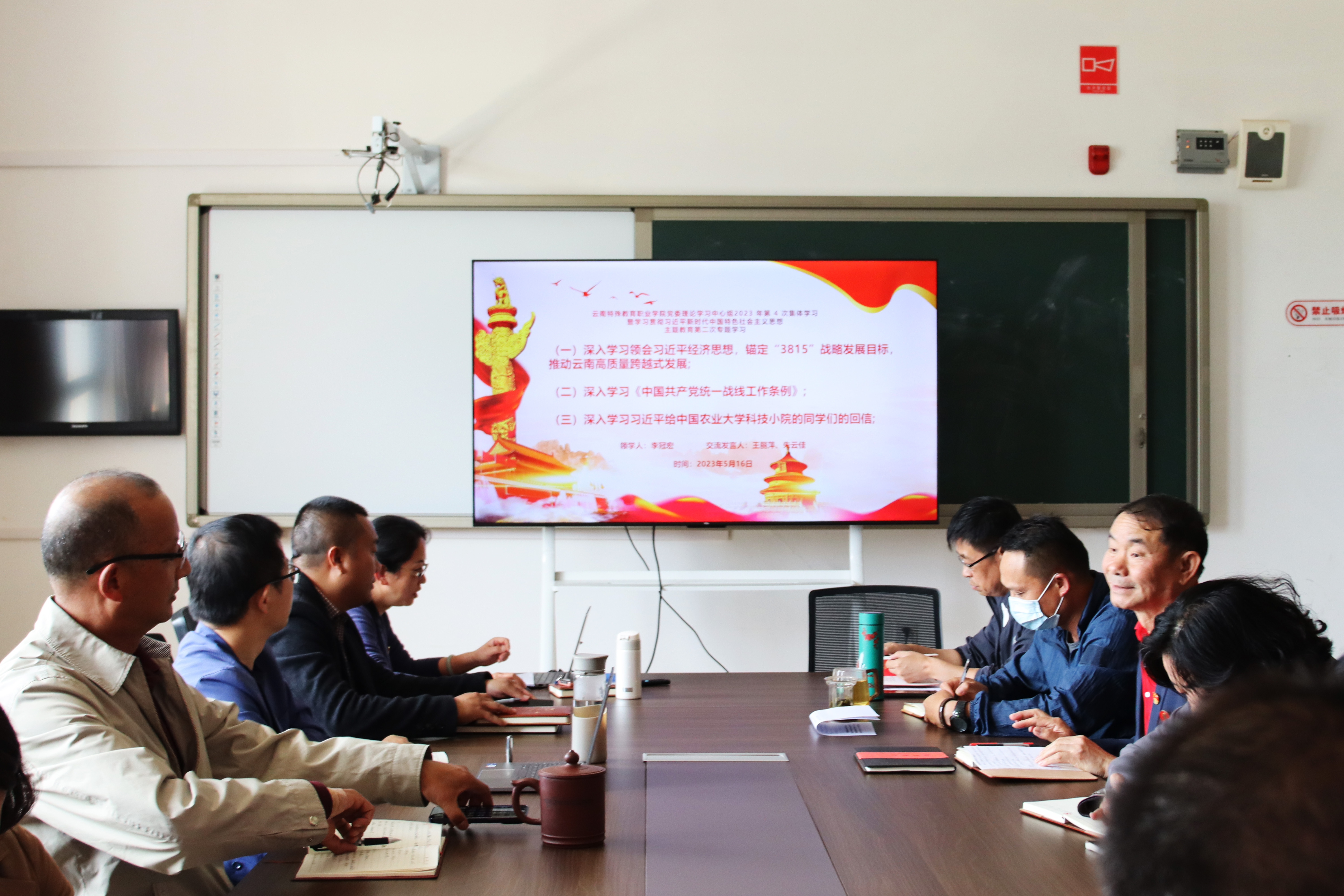 会议强调,一是要深入学习贯彻习近平经济思想,深入落实习近平总书记考察云南重要讲话和重要指示批示精神,按照省委十一届三次全会部署的实施“3815”战略发展目标谋划,聚焦瓶颈补短板,突出关键强弱项,深挖潜能扬优势,守牢底线保安全,凝心聚力促团结,抓实党建强保证,以高质量跨越式发展推进云南社会主义现代化建设确保与全国同步基本实现社会主义现代化。二是认真学习领会《中国共产党统一战线工作条例》修订的背景、过程和意义,抓好《中国共产党统一战线工作条例》的贯彻落实,全面正确理解党的统一战线理论方针政策,提高学校各级党组织和全校师生的统战意识,切实发挥统一战线法宝作用,巩固和发展最广泛的爱国统一战线,为全面建设社会主义现代化国家、实现中华民族伟大复兴的中国梦凝心聚力。三是要认真学习贯彻《习近平给中国农业大学科技小院的同学们的回信》精神,从“科技小院”人才培养模式中探索科研理论与生产实践相结合的路径,重从新农业、新乡村、新农民、新生态建设理念中勇担爱农兴农的时代重任,从“厚植爱农情怀,练就兴农本领”的嘱托中书写广大青年积极投身乡村振兴事业的华彩篇章。