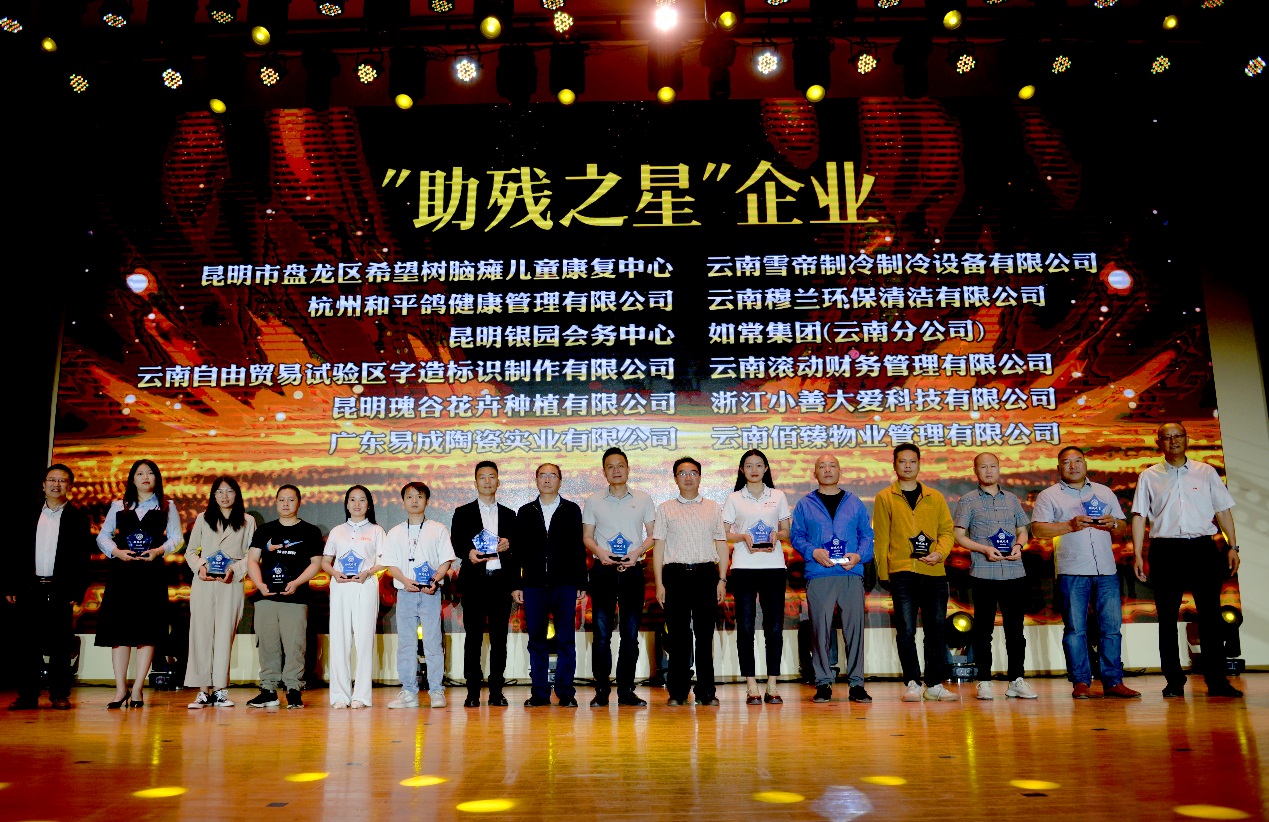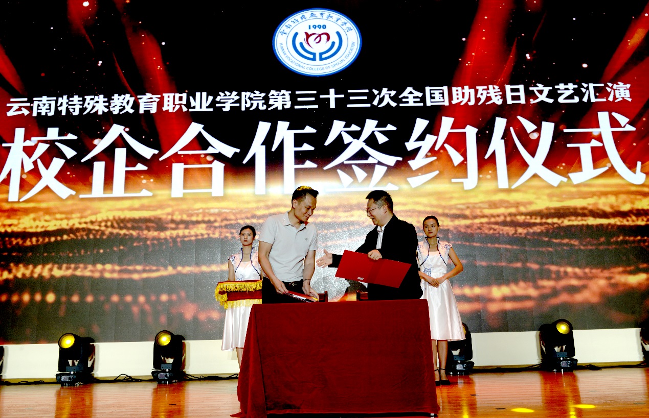 助残日活动现场,学校与广东易成陶瓷实业有限公司、昆明春溢实业企业集团有限公司签署校企合作协议,同时接受了武警云南总队医院、云南省残疾人辅助器具资源中心、云南佰臻物业管理有限公司、东莞亚耕商贸有限公司的爱心捐赠,并授予4家单位“扶残助残”的荣誉称号。同时,为昆明市盘龙区希望树脑瘫儿童康复中心等12家优秀的校企合作单位颁发“助残之星”奖杯。