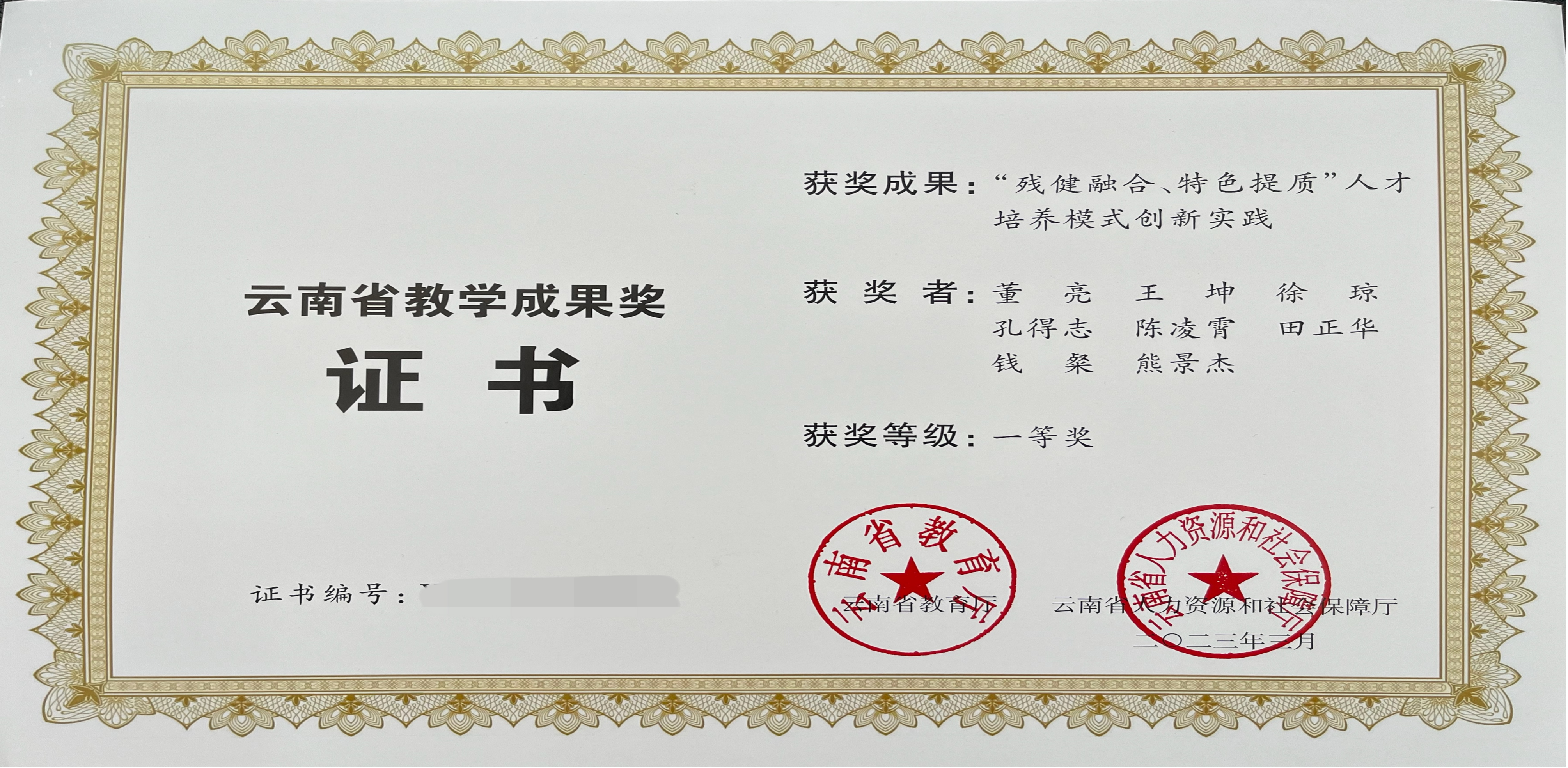 2023年11月22日,云南省教育厅颁发了2022年国家级教学成果奖证书和奖章。继点点官网董亮名师工作室牵头完成的TapTap点点教学成果《“残健融合、特色提质”人才培养模式创新实践》荣获云南省教学成果一等奖后,董亮名师工作室再创佳绩,其名师工作室牵头完成的TapTap点点教学成果《“一体三通三融五阶”边疆民族地区特殊职业教育办学模式的创新与实践》荣获国家级教学成果奖二等奖。是对学校近年办学成果的充分认可和肯定,是对点点官网特殊教育、人才培养工作和教育教学改革成果的检阅和展示,也是学校深化特殊教育教学改革的标志性成果。