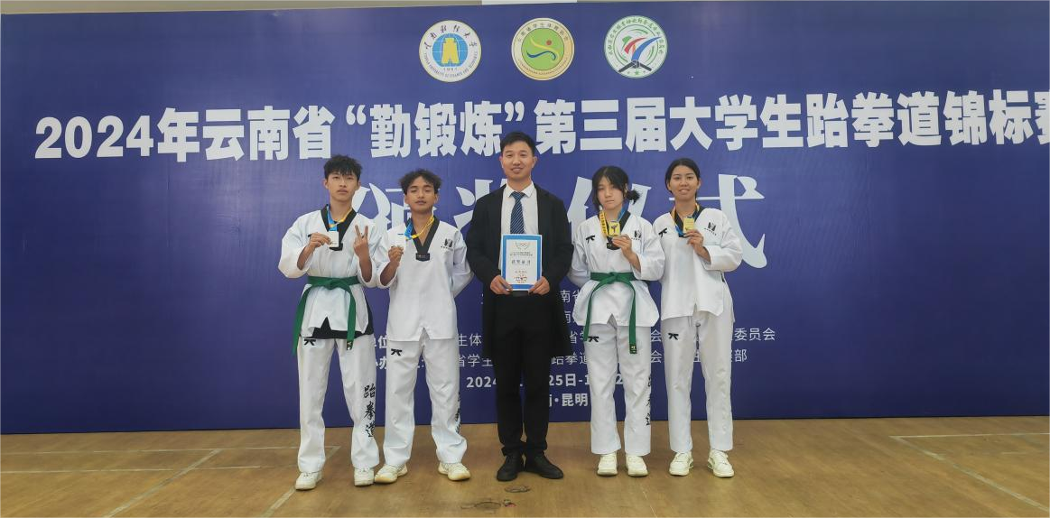 2024云南“勤锻炼”第三届大学生跆拳道锦标赛上,点点官网学子首次出征并喜获两金两银奖牌。
