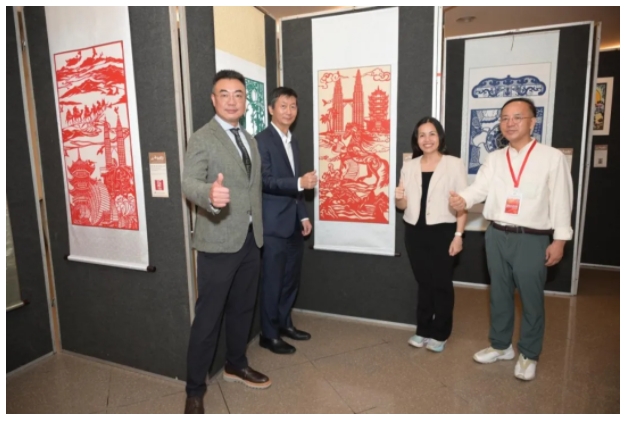 马来西亚通讯部张念群副部长,马来西亚吉隆坡暨雪兰莪中华大会堂颜登逸会长,中国云南省中华文化促进会蒙秦主席,云南省中华文化促进会剪纸艺术委员会罗磊副会长在我们听障学生作品前合影、点赞。