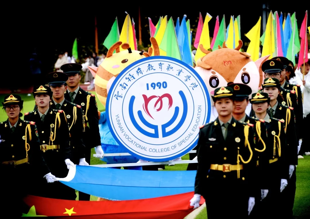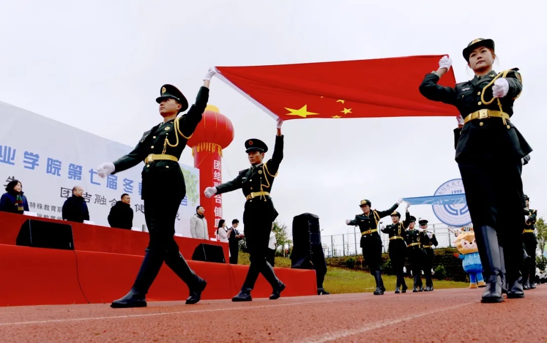 国旗方队率先入场,护旗队员目光坚毅,步伐铿锵,鲜红的旗帜在冬日暖阳下熠熠生辉,每一步都诠释着对祖国的深情礼赞。紧随其后的是校旗校徽方阵,他们昂首前行,蓝白校旗与校徽交相辉映。他们手擎信念,胸怀理想,每一步都彰显着新时代特教学子的责任与担当。
