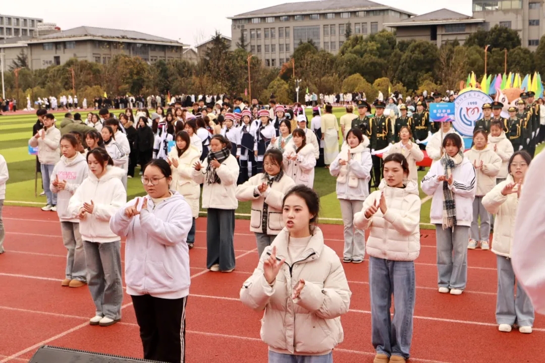 教育与康养学院方阵,着统一服装,精神抖擞,以“手语传情”为特色闪亮登场。风之队同学用手语传递“爱与奋进”的信念,动作流畅有力,指尖流淌着温暖与力量。