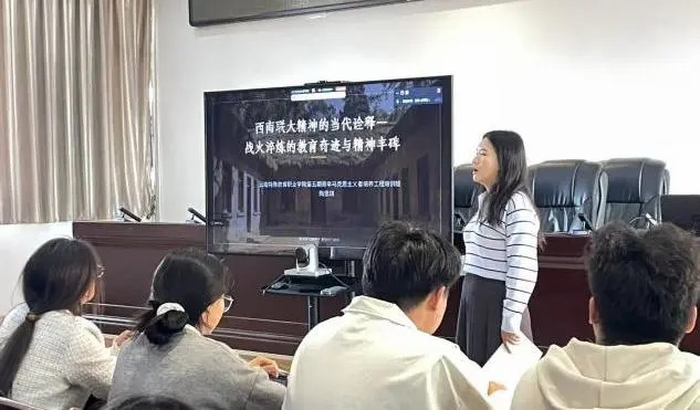 陶老师结合历史影视短片,从西南联大的建校背景和办学历程、解读刚毅坚卓的文化内核、当代精神传承、新时代青年学子的使命与担当等方面,阐释了联大师生是如何在战火纷飞、物资匮乏的年代,走出一条“刚毅坚卓”的教育报国、强国之路。讲座生动展现了西南联大先贤兼容并包、矢志报国的博大情怀,爱国进步人士投笔从戎、奋起抗争的革命精神,师生不畏艰险、奋发图强的精神风貌,以及他们为民族救亡与复兴所作出的卓越贡献。同时,陶老师还介绍了当代青年学子通过组建宣讲团、开展支教活动等形式,传承与践行联大精神的鲜活案例。