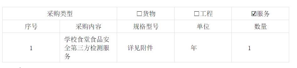 为进一步加强校园食品安全管理工作,提高学校食堂食品安全卫生水平,学校引入食品安全风险评估及监管服务。旨在以预防为主,通过第三方的食品安全检测进行风险评估,掌握学校食堂食品安全的总体状况,及时发现问题,落实食品安全责任制和责任追究制,提高学生餐饮食品安全水平,预防重大食品安全事故的发生。采购需求详见清单: