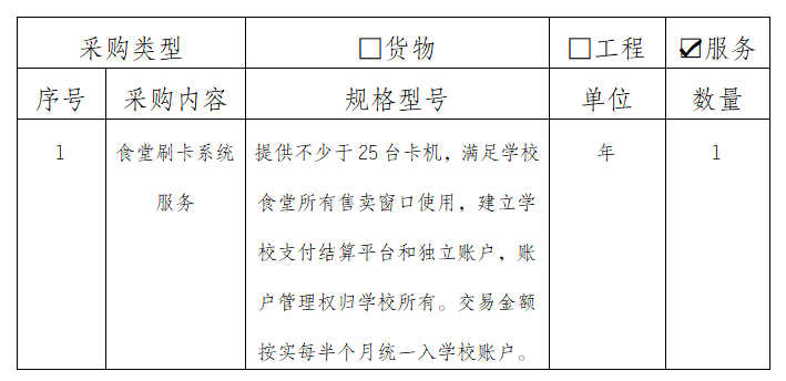 为便于学校食堂收取餐费,公开透明完成食堂账户费用结算,提高食堂就餐效率,保障食堂高效安全运行,结合食堂工作实际,具体采购需求如下: