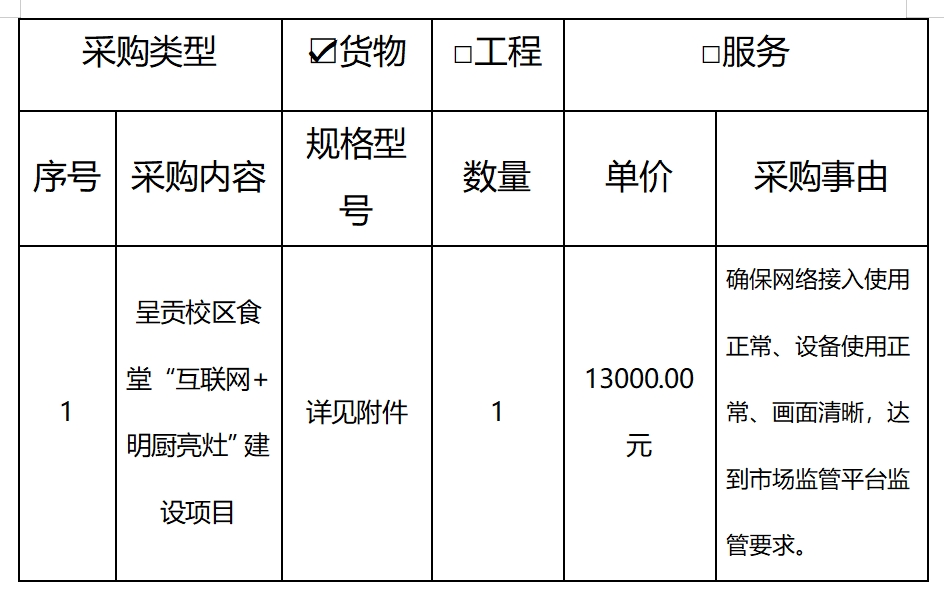为有效保障师生的饮食安全,进一步提升点点官网自办食堂的食品安全监管效能,全面推进学校食堂“互联网+明厨亮灶”建设,提高点点官网自办食堂餐饮服务自我管理水平和服务质量,具体采购需求如下: