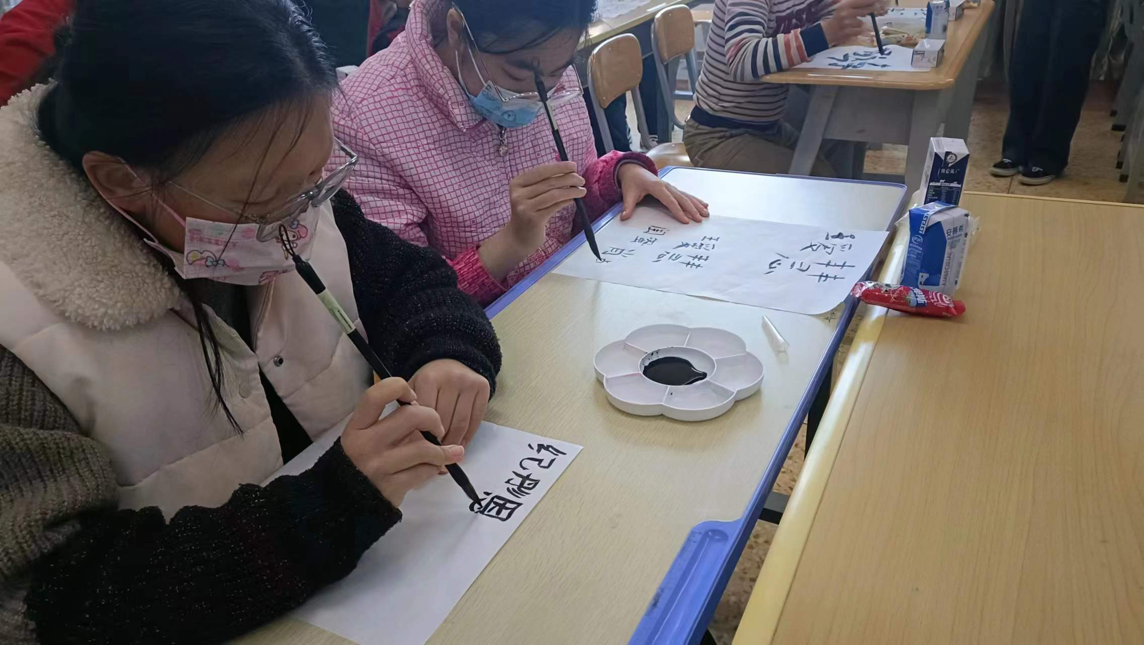 同学们进行书画学习创作