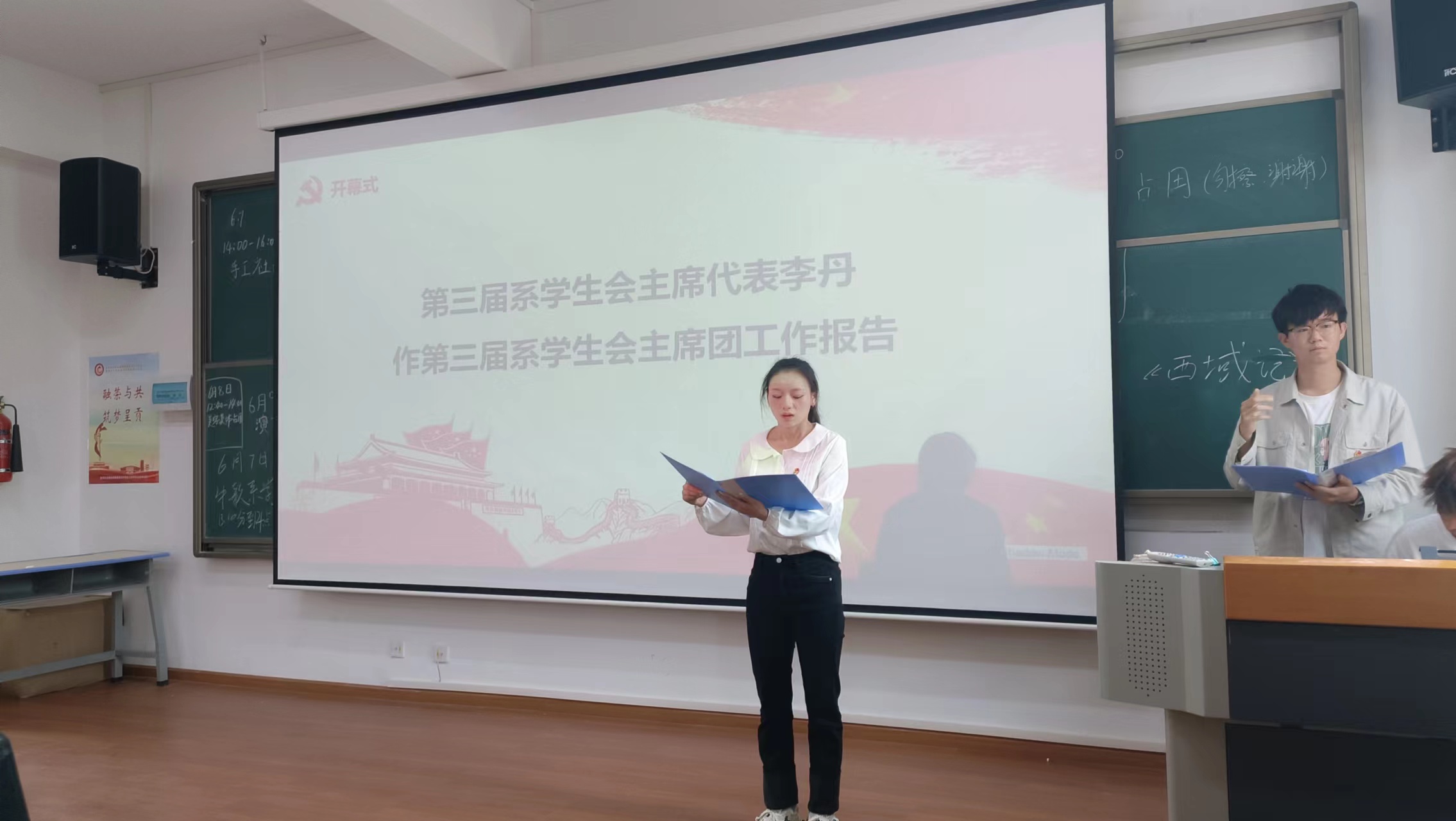 首先由主持人介绍到会领导、教师,并介绍此次大会议程,会议议程主要包括:系部副书记尹文静致开幕词;听取第三届学生会主席团工作报告;通过大会监票人、计票人、唱票人名单;进行选举。