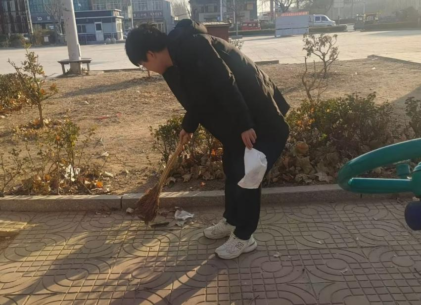 图为王明华同学进行社区服务