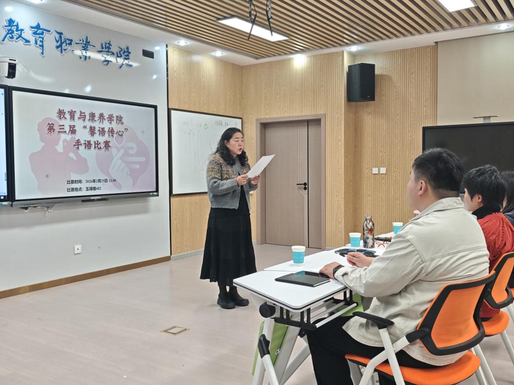 活动伊始,主持人首先登场,向到场的各位老师、同学致以热烈欢迎,并简要介绍了本次“馨语传心”手语比赛的举办意义与流程安排,随后邀请教育与康养学院党支部书记邓迎上台致辞。