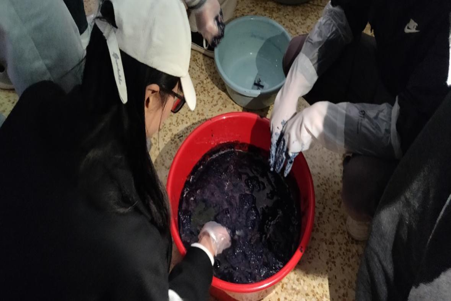 图为师生们配合文化传承基地成员浸染布料