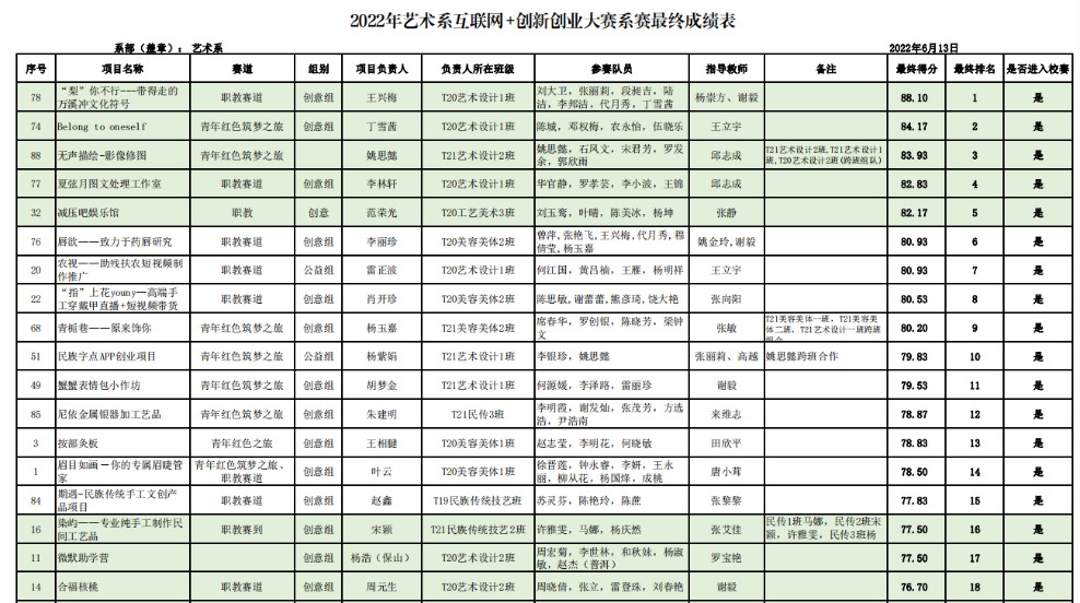 2022年6月10日,艺术系在实训楼309教师举办了学院2022年“互联网+”大学生创新创业大赛初赛,共93个项目参赛,其中有45个“青年红色筑梦之旅”赛道项目,有48个职教主赛道项目;系部共24名教师指导了500余名学生,其中有4个班级的108名听障学生组建了20个项目在该赛事中与其他同学同台竞技。经专家初审后,根据积分排名前45个项目进入系部初赛,前32个项目进入路演,最终评审出18个项目进入校赛。