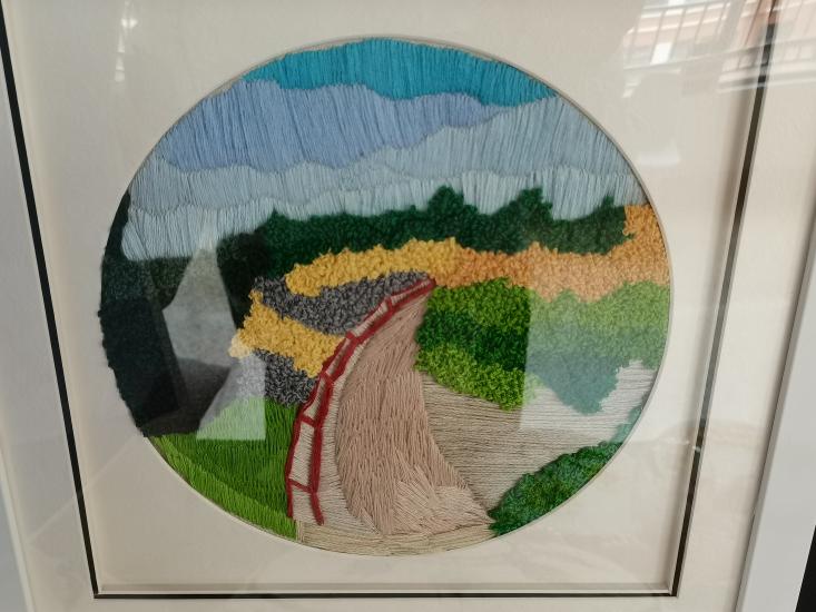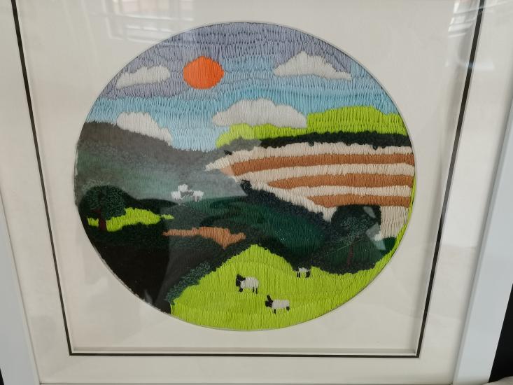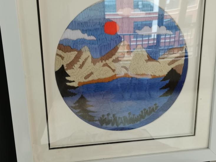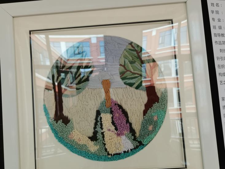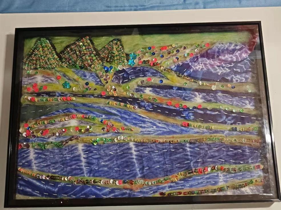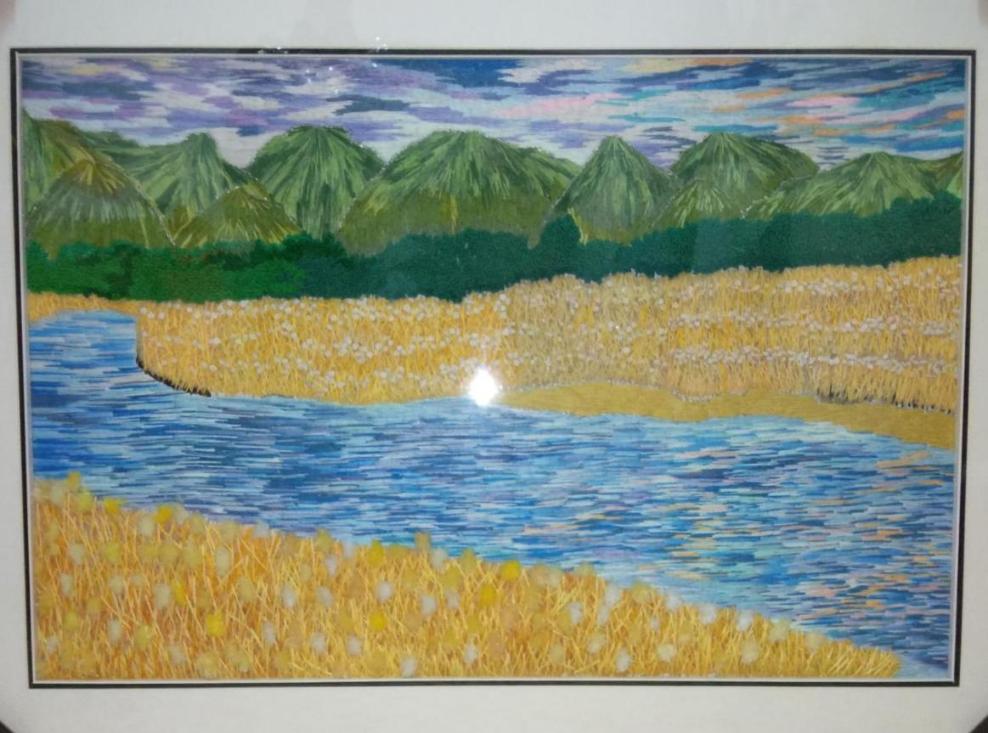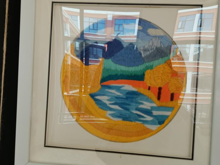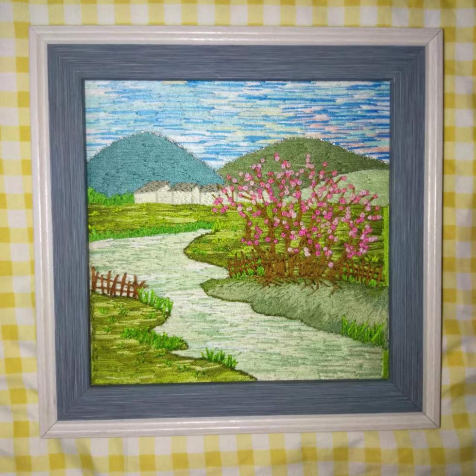 刺绣,又名“针绣”,俗称“绣花”。以绣针引彩线(丝、绒、线),按设计的花样,在织物(丝绸、布)上刺缀运针,以绣迹构成纹样或文字,是我国优秀的民族传统工艺之一。我用刺绣方法展现出了家乡的山水风情,画中采用了刺绣中的平面绣,结粒绣,长短针绣等的刺绣方法,用不同的方法来展示不同的风景,一针一线的体现出家乡的美,作品采用最常见的针法来展现图,绣工艺流程包括:上绷、画样、配线、劈线、刺绣、落绷、成和。通过这些程序最后才展现出农民幸福的生活。
