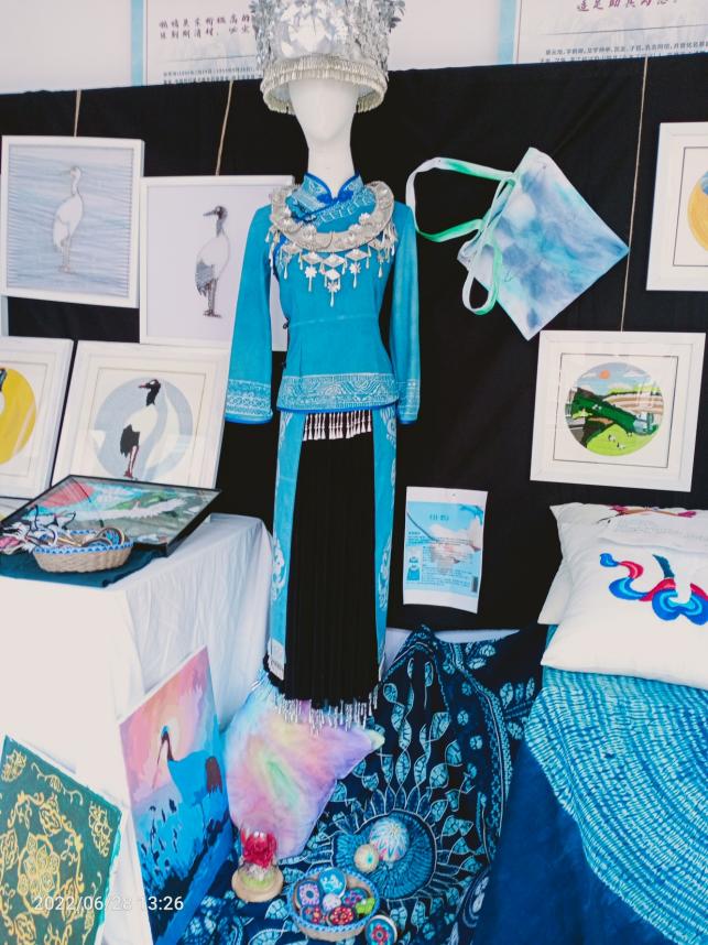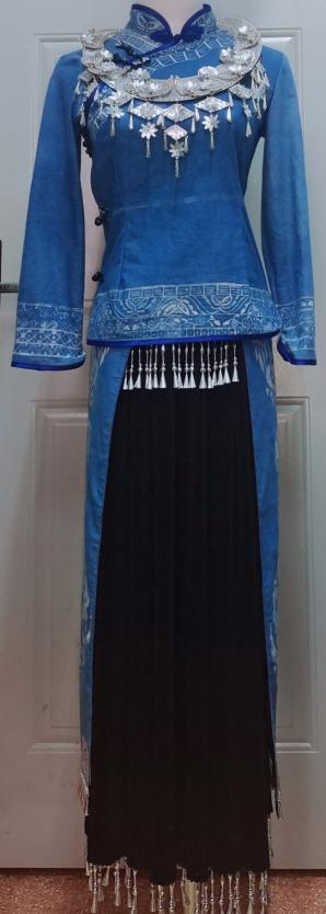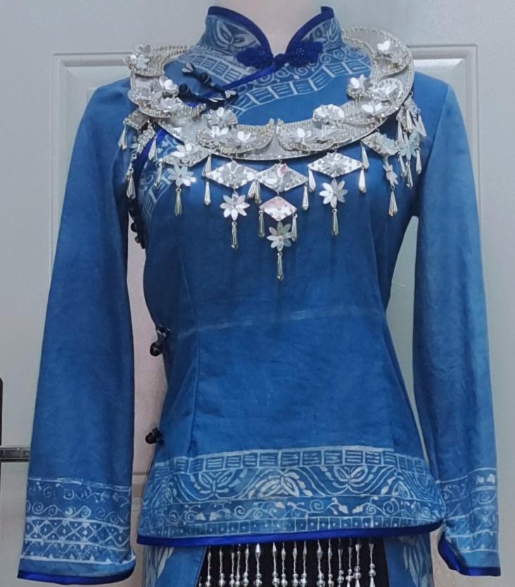 服装:此次服装运用蜡染技艺,结合壮族花鸟纹、铜鼓图案、祥云纹、凤凰图案,借鉴了改良试旗袍,一改壮族“鸟衣”两边翘起形态,。