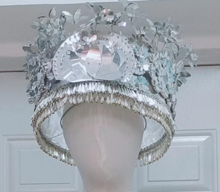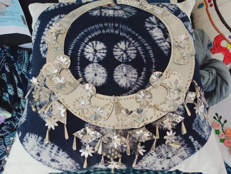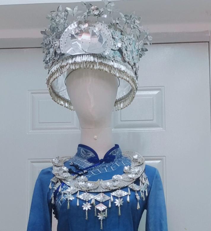 帽子及银项链:主体通过铝片剪、刻、折、画等一系列手法制作而成,运用了花朵、祥云、芝麻坠等元素,帽子、项链结合苗族苗冠和银围帕及壮族花朵图样,花朵的形态美被运用在帽顶上,千姿百态的花朵在铝片光泽的折射下栩栩如生,芝麻坠的垂坠感为帽子和项链增添了许多色彩。