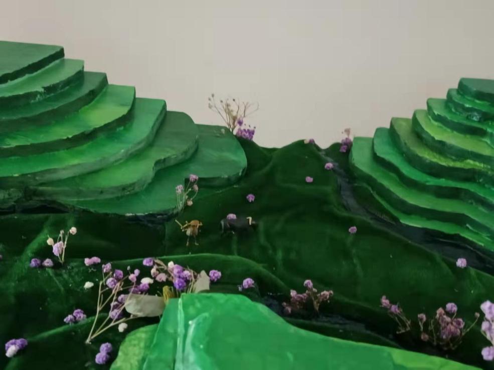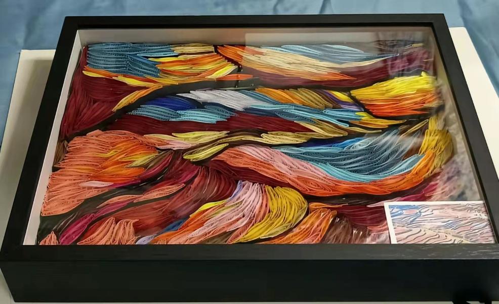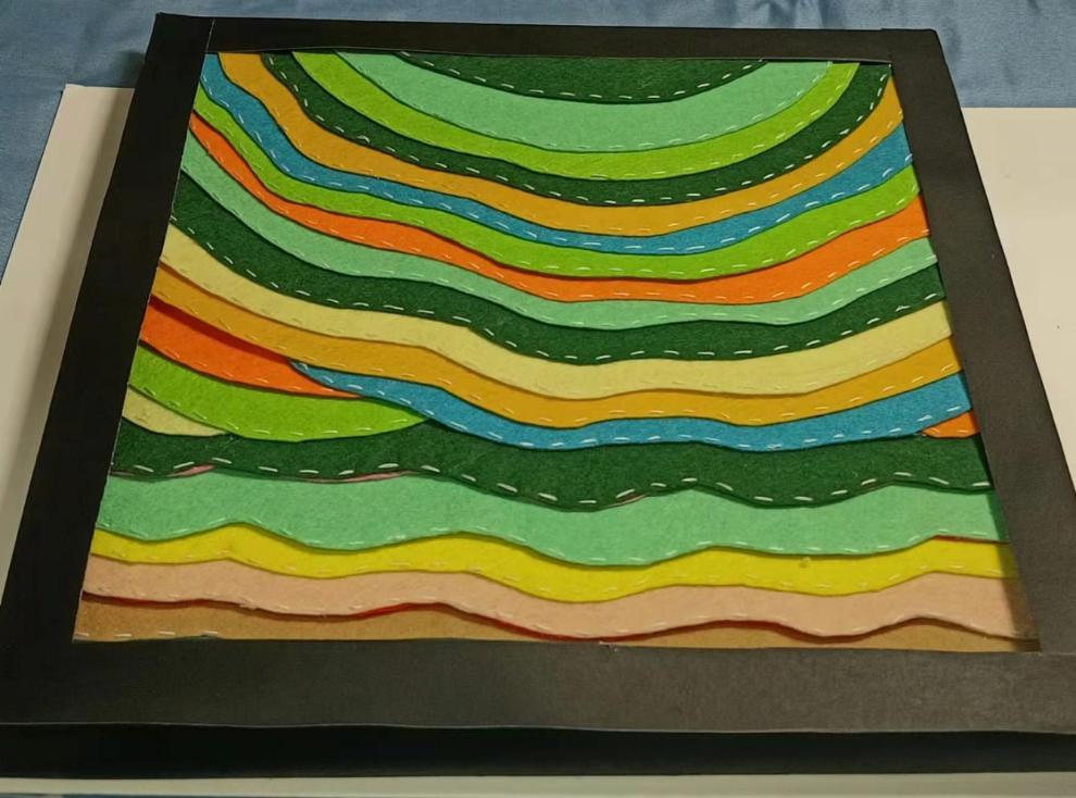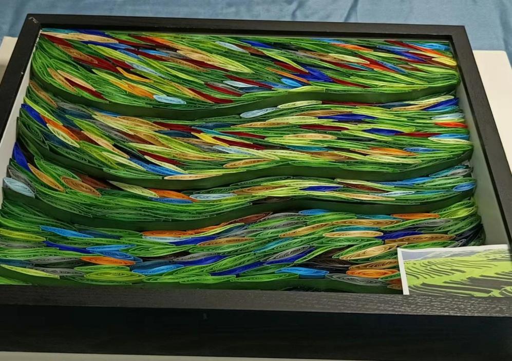 《五彩云梯》描绘了位于云南省红河州哈尼梯田。2013年6月22日,红河哈尼梯田被成功列入世界遗产名录,成为中国第45处世界遗产。当地“一山分四季,十里不同天”“山有多高,水有多高”的特殊地理气候,造就了梯田农耕文明景观。哈尼梯田呈现森林——村寨——梯田——水系“四素同构”的生态农业系统,又因天气和水中植物不同呈现不同的色彩,使得梯田五彩缤纷,像一幅打翻了颜料的油墨画,色彩缤纷。每当雨季来临,雾气缭绕,五彩梯田犹如云梯,绵延而上,唯美壮阔。我以雪弗板(模型)、衍纸,掐丝、不织布、布贴画的表现形式展现出梯田,从而勾勒出这幅风光旖旎的哈尼“五彩云梯”。