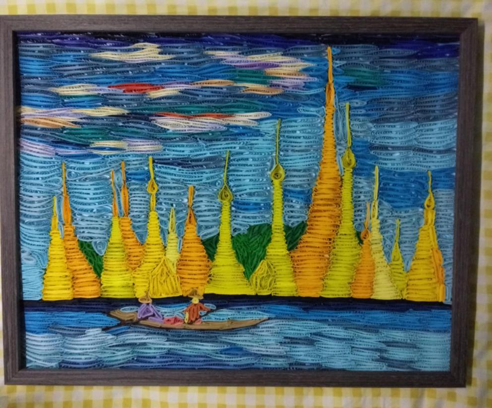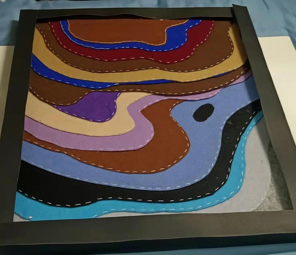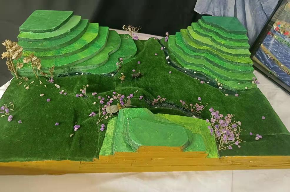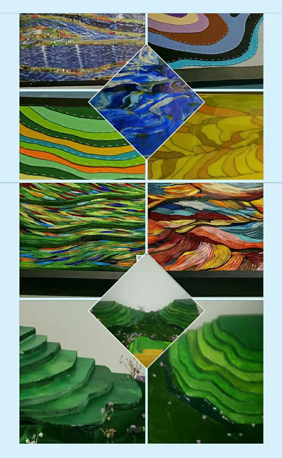 《五彩云梯》描绘了位于云南省红河州哈尼梯田。2013年6月22日,红河哈尼梯田被成功列入世界遗产名录,成为中国第45处世界遗产。当地“一山分四季,十里不同天”“山有多高,水有多高”的特殊地理气候,造就了梯田农耕文明景观。哈尼梯田呈现森林——村寨——梯田——水系“四素同构”的生态农业系统,又因天气和水中植物不同呈现不同的色彩,使得梯田五彩缤纷,像一幅打翻了颜料的油墨画,色彩缤纷。每当雨季来临,雾气缭绕,五彩梯田犹如云梯,绵延而上,唯美壮阔。我以雪弗板(模型)、衍纸,掐丝、不织布、布贴画的表现形式展现出梯田,从而勾勒出这幅风光旖旎的哈尼“五彩云梯”。