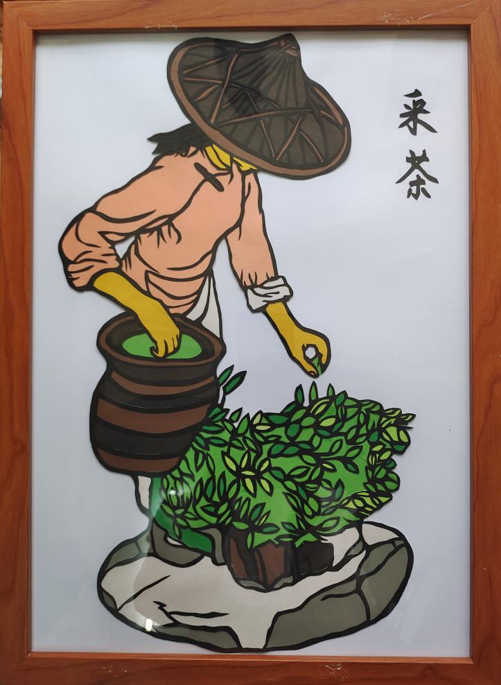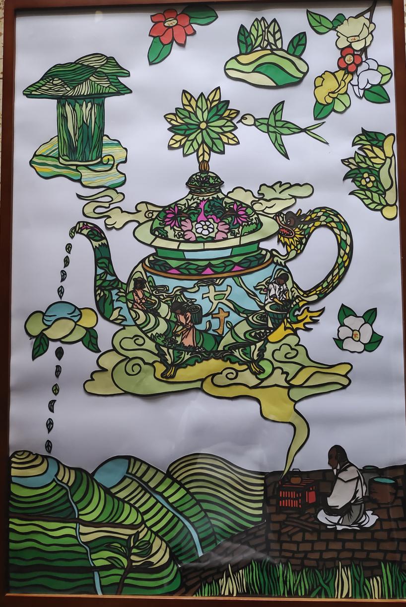 大幅剪纸(创意茶园设计)采用创意与现实相结合的表现形式,利用彩色卡纸进行套色,给人以视觉上的冲击。作品主体由三个部分构成,第一部分是现实的体系一位老人面对茶园,煮茶而饮,体现了对田园生活的向往;茶壶,也就是第二部分,通过老人煮茶的小茶壶,延伸出一个飘在彩云之上创意茶园,茶园整体被茶壶包裹,满园春色生生不息;第三部分主要起到拓展的作用,主要由山茶花、彩云跟屹立在茶杯上的茶山构成;小幅剪纸表现的内容则为制茶最基础的4个步骤(采茶、炒箐、揉捻、烘干)。
