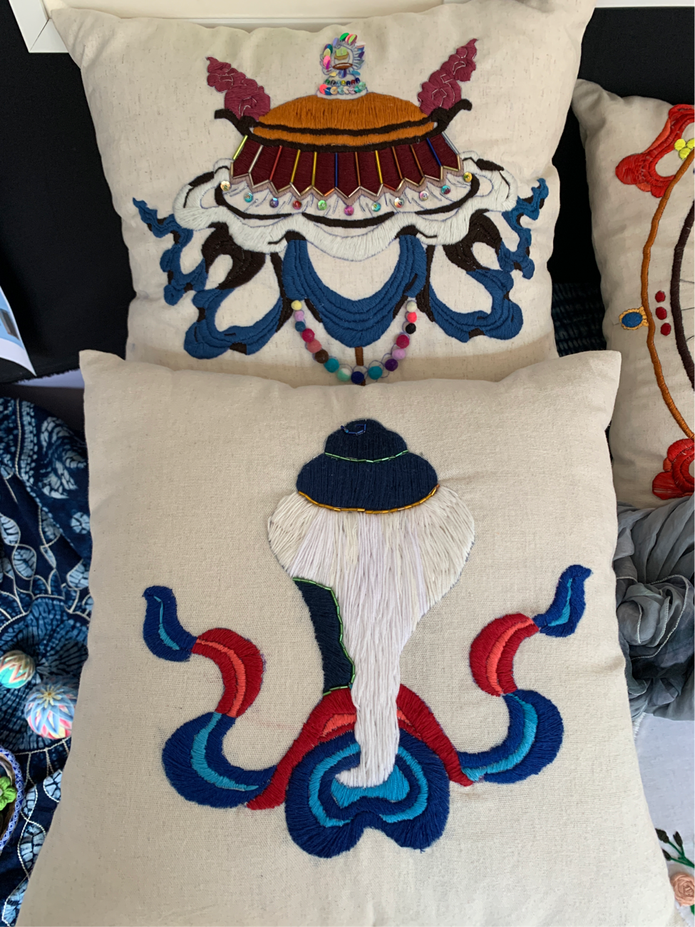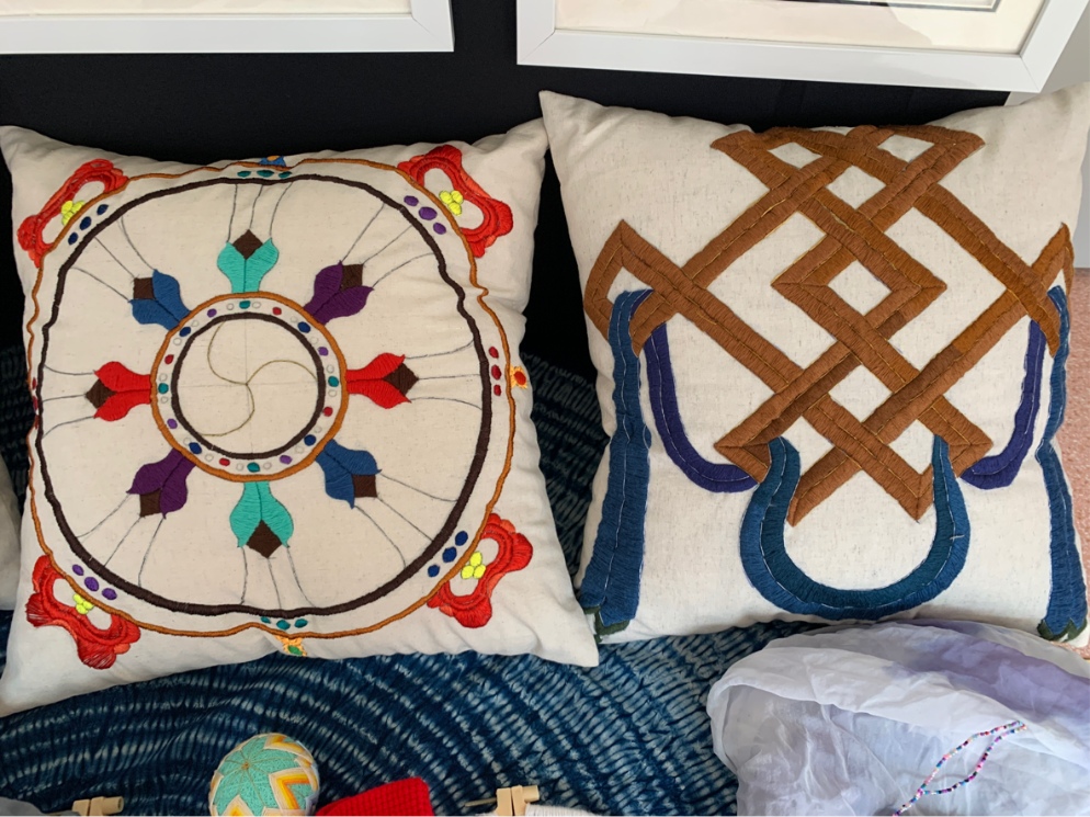 《艺语吉藏》用艺术表达了藏文化,作品通过借鉴藏族八吉祥中的宝伞、白海螺、盘长、法轮,用刺绣的方式展现在日常生活中所需的抱枕上,宝伞寓意着保护众生、白海螺寓意着好运常在、盘长寓意着长命百岁、法轮寓意着生命不息。