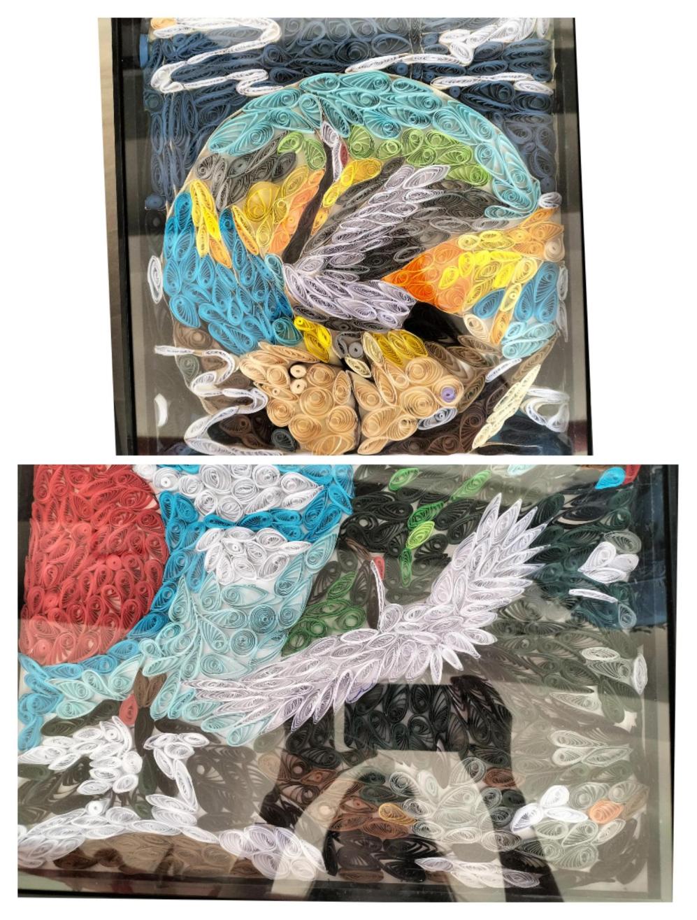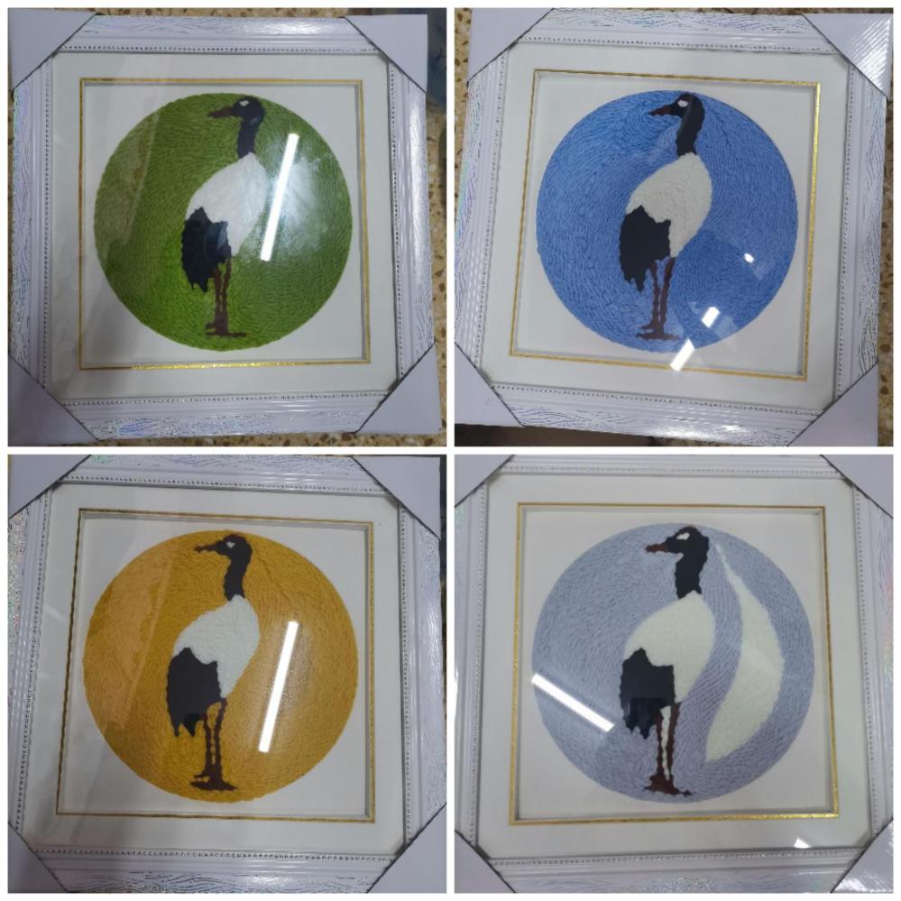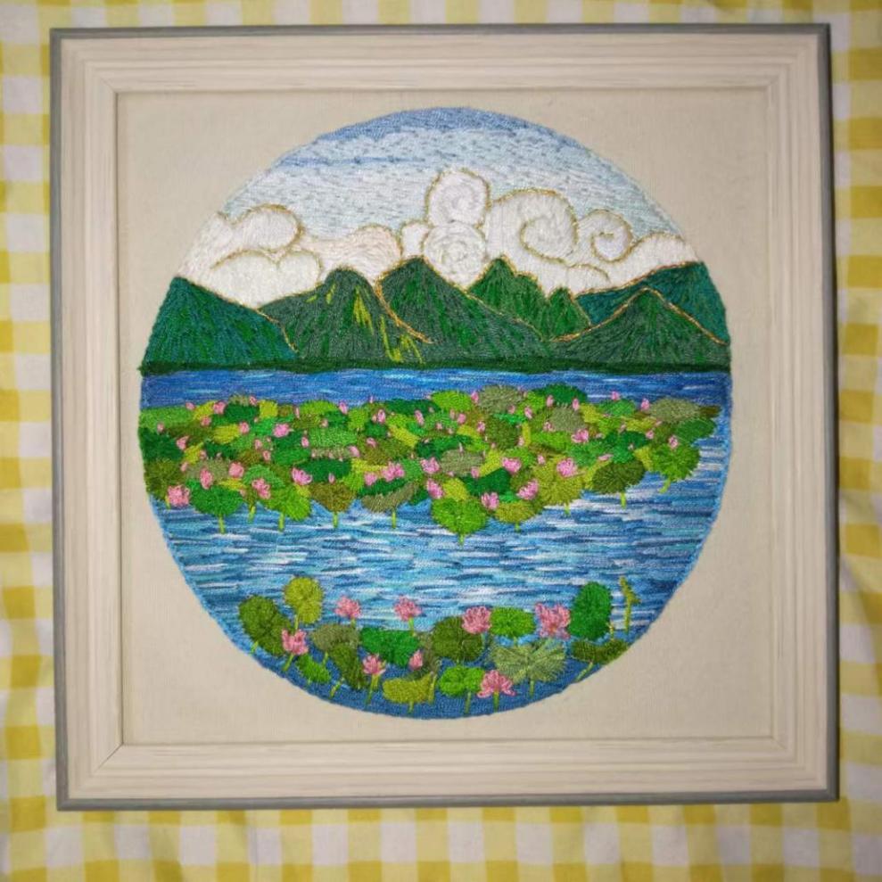 作品《映景滇西 盈江》尤如其名,展示了位于滇西边境盈江县的秀丽自然及其人文风光,在近百里的沿岸,水秀山青,竹幽林茂,景色旖旎迷人,养育一方水土的大盈江;在当地傣族人民视若吉祥、欢跃、令人向往的允燕佛塔,被誉为德宏香格里拉的“诗蜜娃底”,还有带有神话传说,姐告村边的“喃幕西双”(十二眼井),因而汇聚成这汪汪一碧的香额湖。作品以民族刺绣为主要,衍纸为辅的表现方式,分别由四个作品共同诠释映景滇西 盈江这个大主题。我以绣线为画笔,一丝一针勾勒着我的家乡。