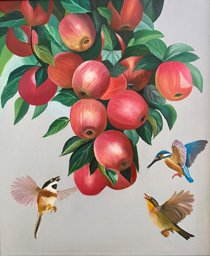 作品具有一定的学术性和创新性,在创新性方面表现得特别突出,给人予耳目一新的感觉。学生用油画材料在布面上绘制花卉、水果、花鸟、动物及精美的果盘瓷器等,创意新颖,装饰性较强,色彩灿烂,把油画技能和生活中自己感兴趣的所有物件巧妙结合在一起,体现了绘画和实物的巧妙结合,在训练学生动手能力的同时,又培养了学生的想象力和创造力。创作方法较规范,充分利用了以前所学的绘画技法。存在的问题及不足之处是,造型还可以再大胆、现代一些,用色可以再灿烂、鲜艳一些,细节刻画可以更细腻一些。
