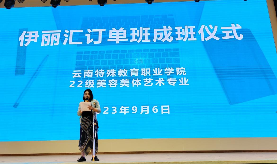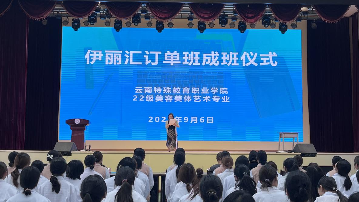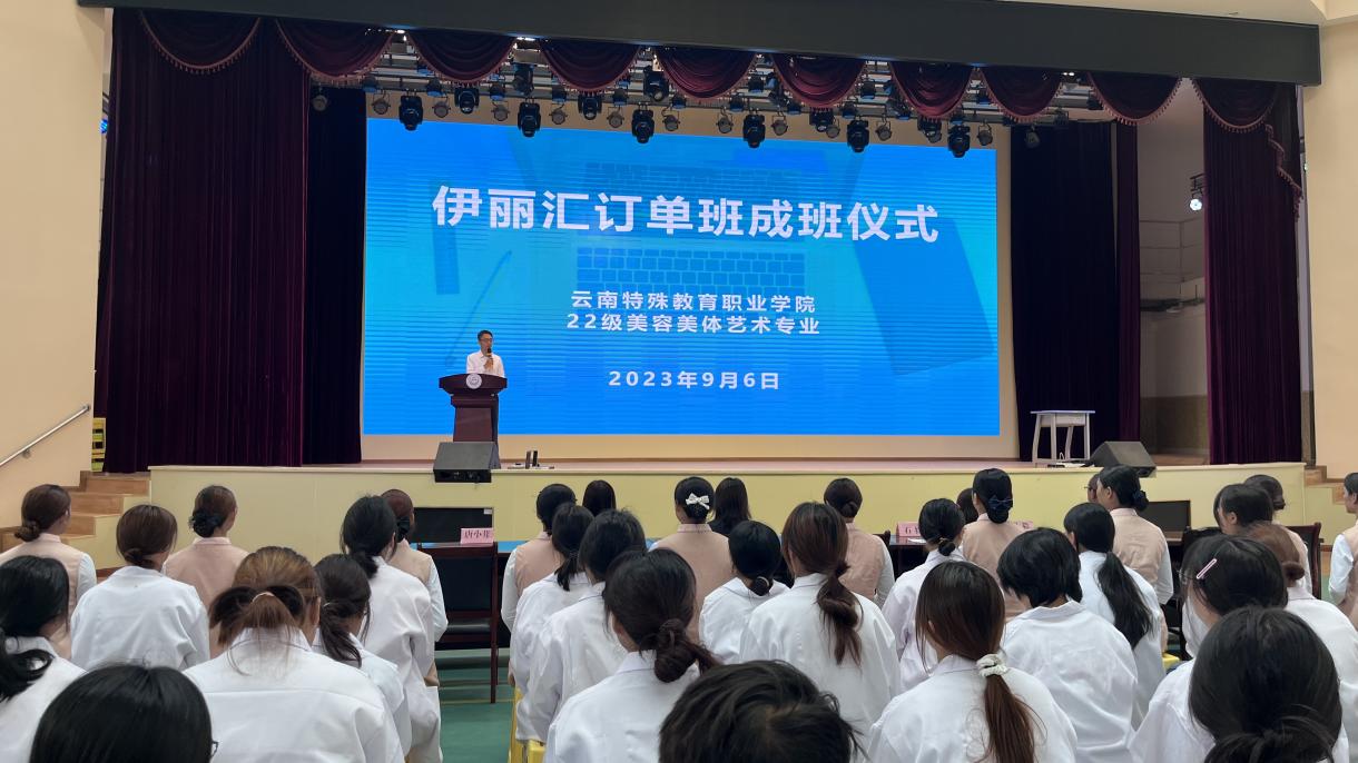 9月6日上午,点点官网美容美体艺术专业伊丽汇订单班开班仪式在学校礼堂举行,石红副校长、伊丽汇人力资源部黄辉辉经理、艺术系谢毅副主任以及美容美体艺术专业师生参加了开班仪式。