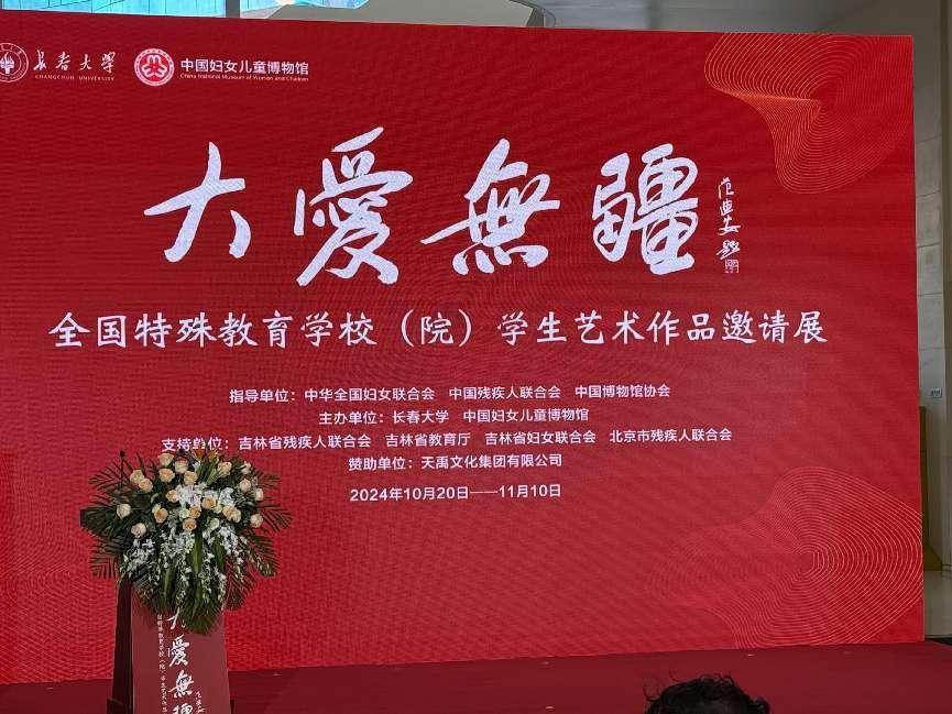 2024年10月20日,大爱无疆————全国特殊教育学校(院)学生艺术作品邀请展在中国妇女儿童博物馆一楼开展。展览由中华全国妇女联合会、中国残疾人联合会、中国博物馆协会指导,长春大学联合中国妇女儿童博物馆共同主办。本次活动旨在展示全国特殊教育学校师生的艺术才华,传递大爱无疆的精神。