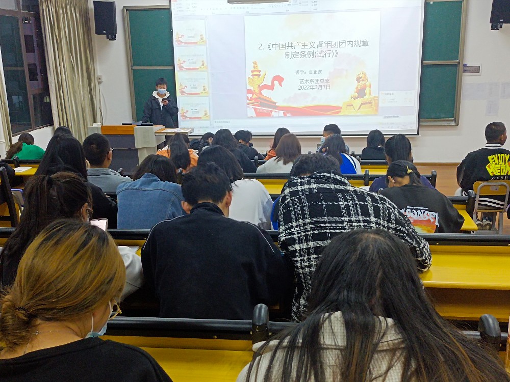 为认真落实共青团十八届六中全会精神,组织全体团员团干部学习团内规章制度,进一步严肃团的纪律,纯洁团的组织,教育引导广大团员坚决拥护党的领导,遵守国家法律法规,把坚持党的领导贯彻落实到全体团员的教育、管理、监督全过程。2022年3月7日,艺术系团总支在实训楼310组织开展团课学习活动,艺术系团干部及学生会成员50余人参与学习,本次团课学习活动采取团总支支委成员领学的形式开展。